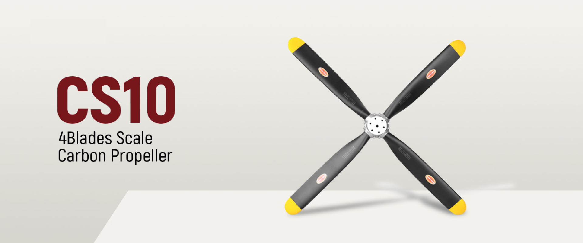 The CS10 is a 4-bladed scale propeller that offers the reliability of a conventional carbon propeller. The entire unit—including the hub and blades—is an integrated propeller made of carbon fiber. It is pre-painted with a matte finish and comes with a scale aluminum spinner. The CS10 propeller is widely used in applications involving the Moki 180 & 250 multi-cylinder engines
